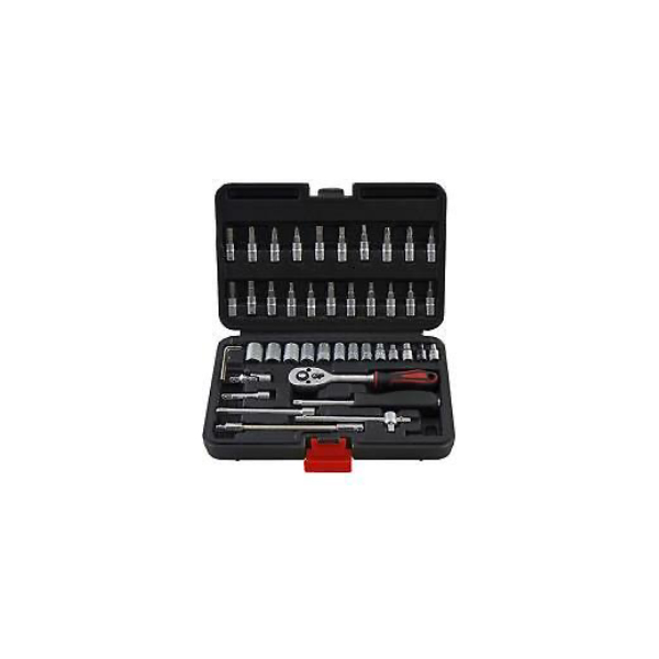 Set bussole 46 pezzi in Cromo Vanadio. 1 cricchetto 45 denti, 13 bussole 1/4″: 4 – 4,5 – 5 – 5,5 – 6 – 7 – 8 – 9 – 10 – 11 – 12 – 13 – 14 mm, 6 inserti a bussola esagonali: 3 – 4 – 5 – 6 – 7 – 8 mm, 3 inserti a bussola taglio 4 -5,5 – 7 mm, 3 inserti a bussola Phillips PH1 – PH2 – PH3, 2 inserti a bussola Pozidriv PZ1 – PZ2, 7 inserti a bussola Torx T10 – T15 – T20 – T25 – T27 – T30 – T40, 1 adattatore per bussole, 2 prolunghe 1/4″ 50 – 100 mm, prolunga flessibile 150 mm, snodo universale 1/4″, chiave a T 1/4″, 4 chiavi esagonali 1,27 – 1,5 – 2 – 2,5 mm, 1 giravite portabussole 1/4″. Confezione: valigetta in ABS