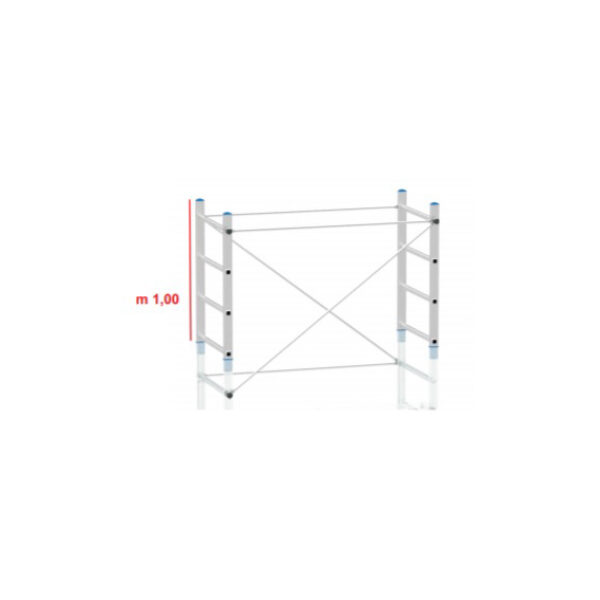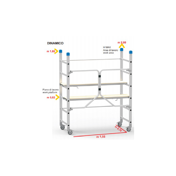 Dinamico si monta velocemente senza uso di viti o attrezzi, richiudibile senza essere smontato, grazie al particolare snodo, occupa solo 26 cm di spazio. Il piano di lavoro doppio, montato sfalsato, facilita la salita, Con l’aggiunta dell’alzata top arriva fino a 4 m di altezza di area di lavoro. Packaging in termoretraibile.